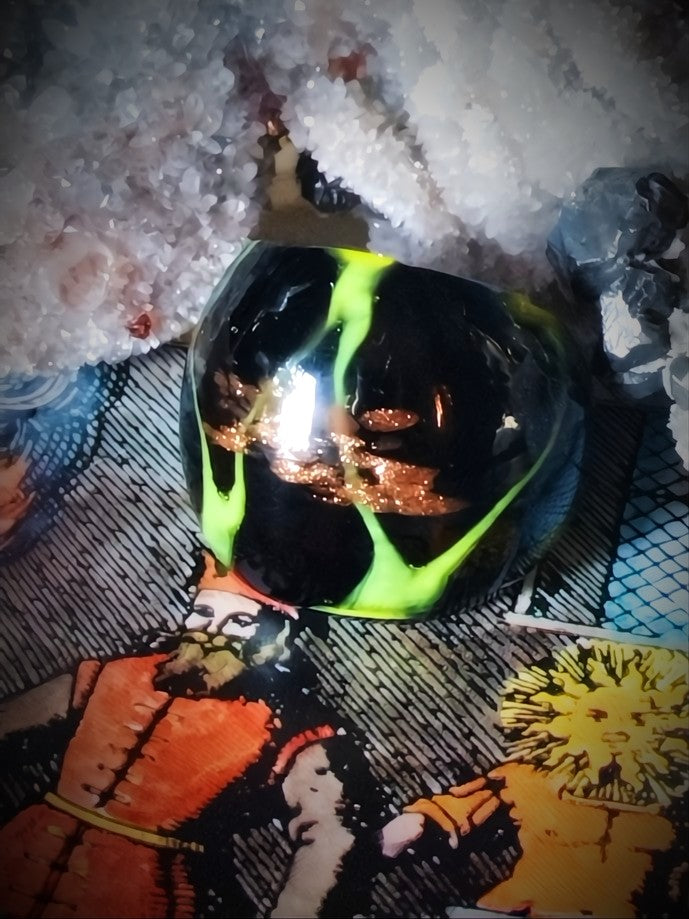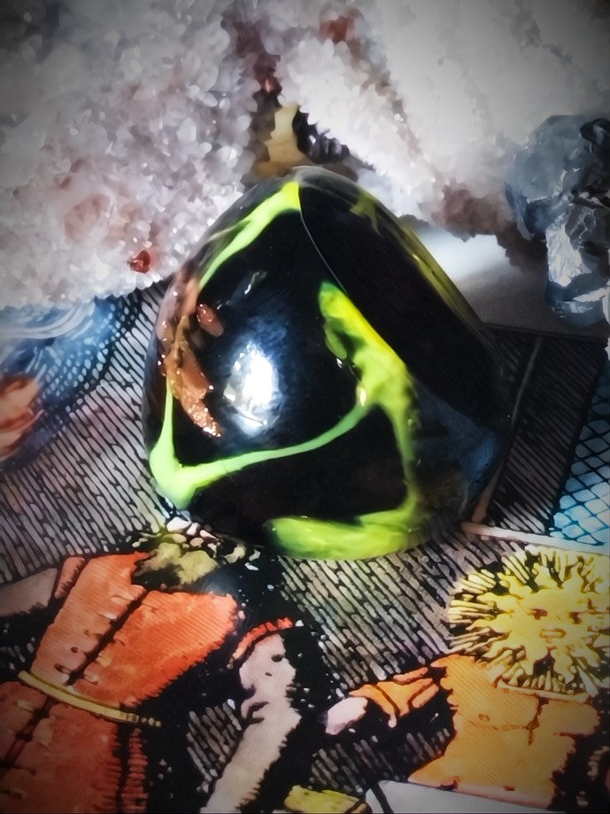 Black as midnight, streaked with neon-green fire and veins of molten gold, the ring radiates like a storm contained in glass.