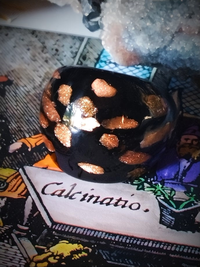 The copper-gold flecks represent the living fire of desire—igniting attraction, magnifying beauty, and kindling passion in the heart of the wearer. The black glass, deep and reflective, serves as the vessel of mystery and control, anchoring the power of seduction within a sovereign field of glamour. To wear it is to become both flame and shadow, both temptation and command.